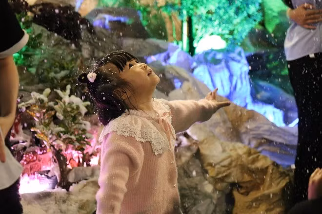 Under the falling foam, many visitors compared the experience to “celebrating Christmas in Europe” in the heart of the city. At churches and parishes, crowds gathered both for Mass and for sightseeing, with numbers increasing as the night went on. Young people dressed in winter-themed outfits for photos, while families brought children to enjoy the festive scenes.