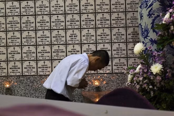 After Mass, many parishioners remained in church courtyards to pray for deceased relatives. In front of memorial walls, they quietly lit candles and offered prayers in remembrance of parents, grandparents and loved ones who had passed away.